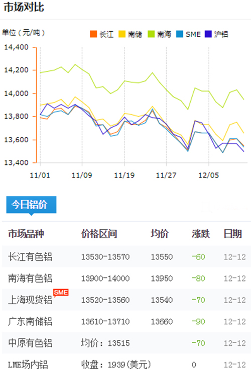 鋁錠價格今日鋁價2018-12-12