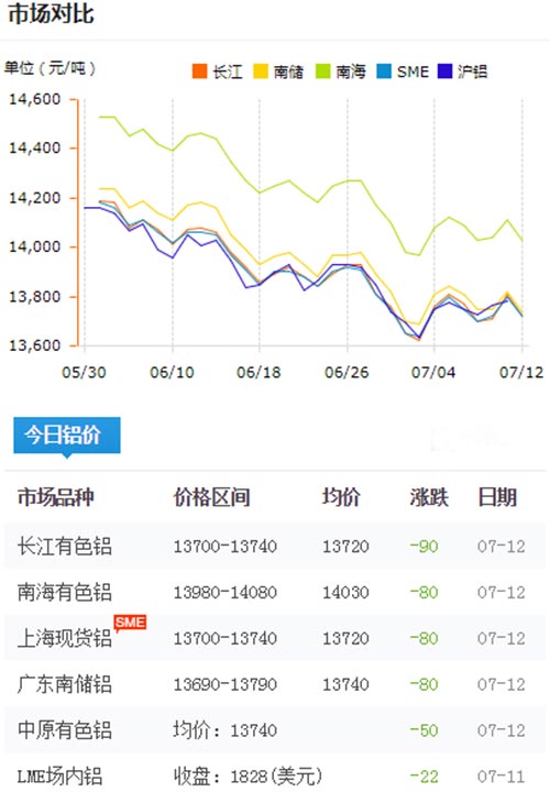 鋁錠價格今日鋁價2019-07-12