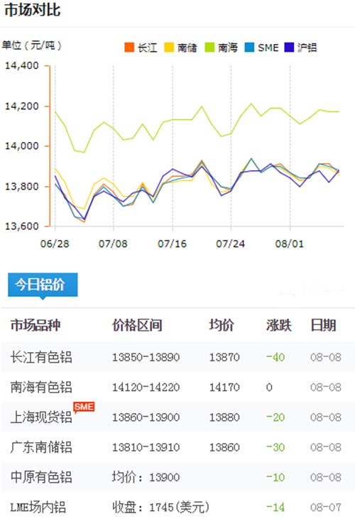 鋁錠價(jià)格今日鋁價(jià)2019-08-08