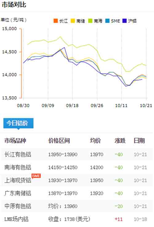 鋁錠價格今日鋁價2019-10-21