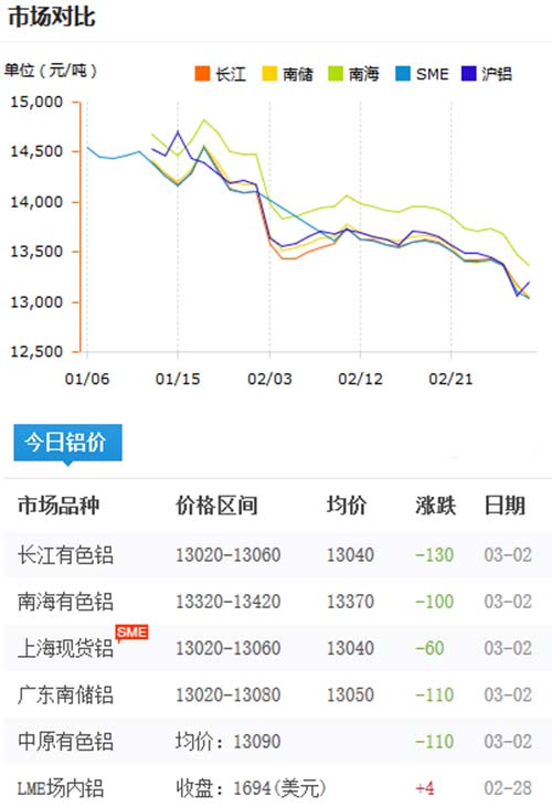 鋁錠價格今日鋁價2020-03-02