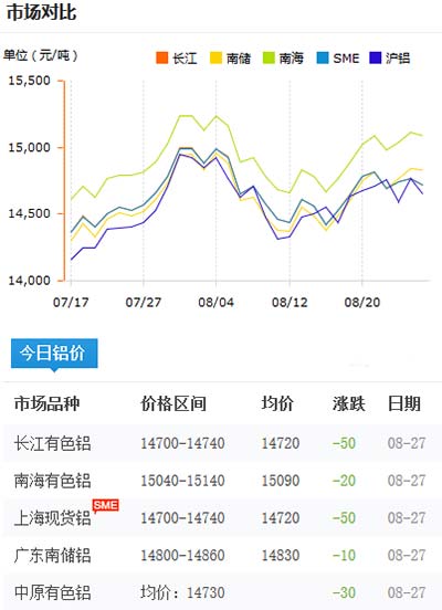 鋁錠價格今日鋁價2020-08-27