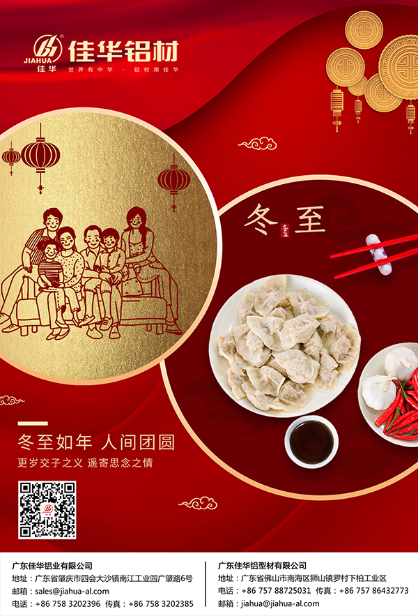 今天是冬至節(jié),冬季的開始,我想送你一縷和煦的陽光,照亮你一路前行;我愿送你一束芬芳的玫瑰,獻(xiàn)給你一季的美麗;我要送你一聲樸素的問候,溫暖你一整個(gè)寒冬。佳華鋁業(yè)祝大家冬至節(jié)快樂。