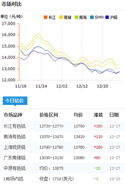鋁錠價格今日鋁價2016-12-27