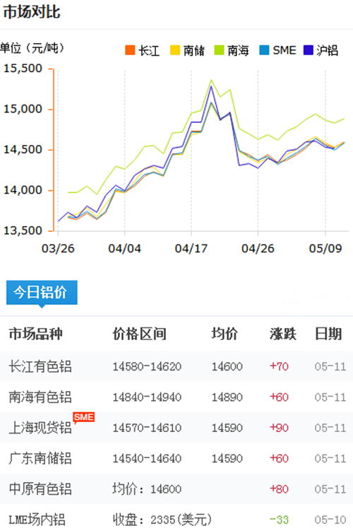 鋁錠價格今日鋁價2018-5-11