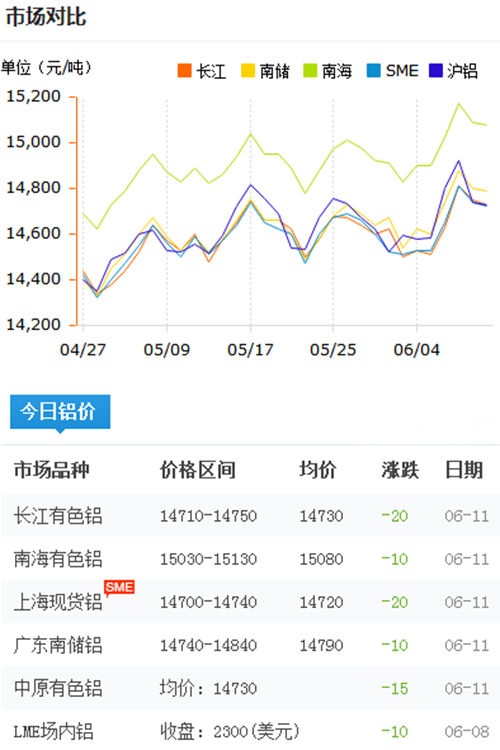 鋁錠價格今日鋁價2018-6-11