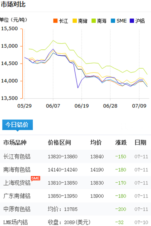 鋁錠價格今日鋁價2018-7-11